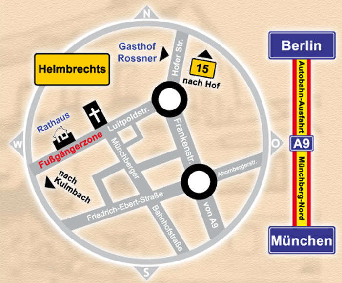 Sie erreichen uns über die A 9 Ausfahrt Münchberg-Nord, über die B 15 von Hof, über die B 173 von Kronach und über die B 289 von Kulmbach kommend.